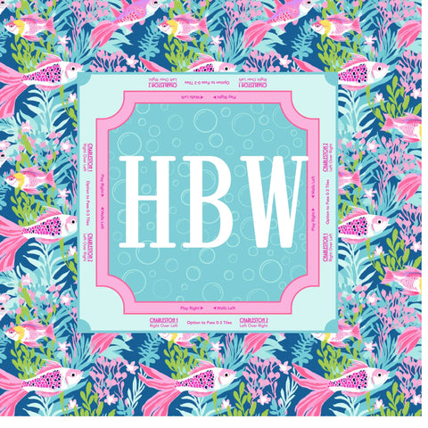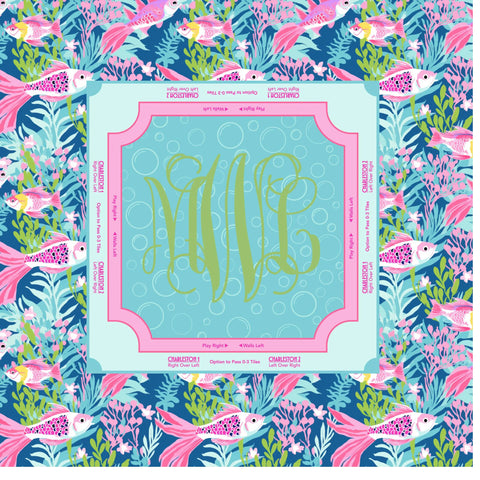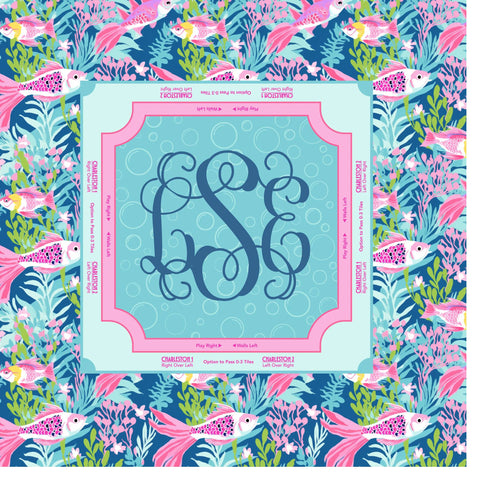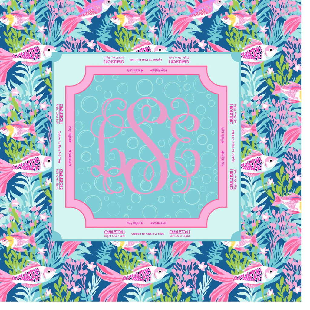 Fish themed mahjong mat that looks as good as it plays. This personalized mahjong mat features a classic pink and green scenic print and a clean border layout that helps keep your table set, your seats clear, and your tiles moving smoothly.